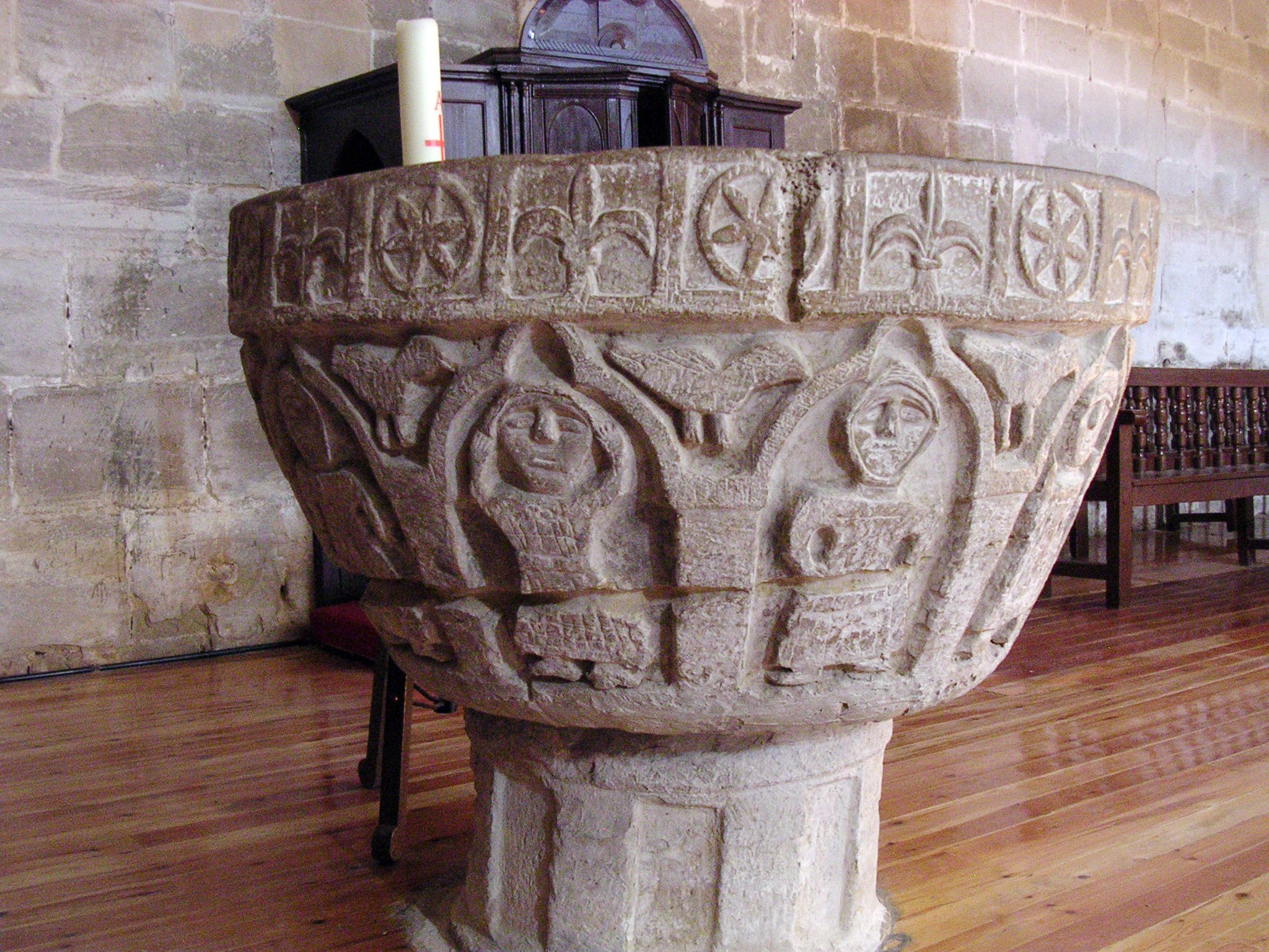 Se trataba de un pequeño recinto bajo el coro, a los pies de la iglesia, que contenía la pila bautismal de piedra labrada que se conserva de la original ermita de Santa Coloma. Es decir, que aunque la iglesia es del siglo XVI, la pila bautismal es del XIII. Los baptisterios se concebían como espacios separados del templo, a veces incluso en edificios diferentes, porque la persona que iba a bautizarse aún no estaba limpia del pecado original y, por lo tanto, no era digna de acceder al interior. En Santa María la Mayor aún puede verse la marca que dejó la verja metálica que limitaba ese espacio, a pesar de que la propia verja hace tiempo que desapareció de la iglesia.