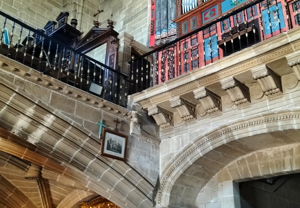 En un principio, para acceder al coro existía una escalera de piedra que estaba adosada a la pared del evangelio (la de la izquierda si estás mirando al altar) que bajaba por el mismo sitio donde hoy está el arco de inicio de las escaleras. De esta escalinata, que bajaría por la pared y posiblemente haría una L al llegar abajo, hoy día sólo queda el arranque del primer escalón, justo entre el balcón del coro y el balcón del órgano. El actual cubo de escaleras se construyó entre los siglos XVI y XVII, para lo que se abrió un hueco en la pared y se construyó una especie de torre dentro de la que se puso la escalera de tres tramos, se creó una sala capitular detrás del órgano y se construyeron dos retretes para uso de los clérigos. Resulta curioso ver que en las instrucciones para este tipo de construcciones se mencionaba que se debía disponer de canteras para sacar la piedra, de pan y vino para los obreros y, además, de pastos y montes para para alimentar a los animales de tiro que se utilizaran.