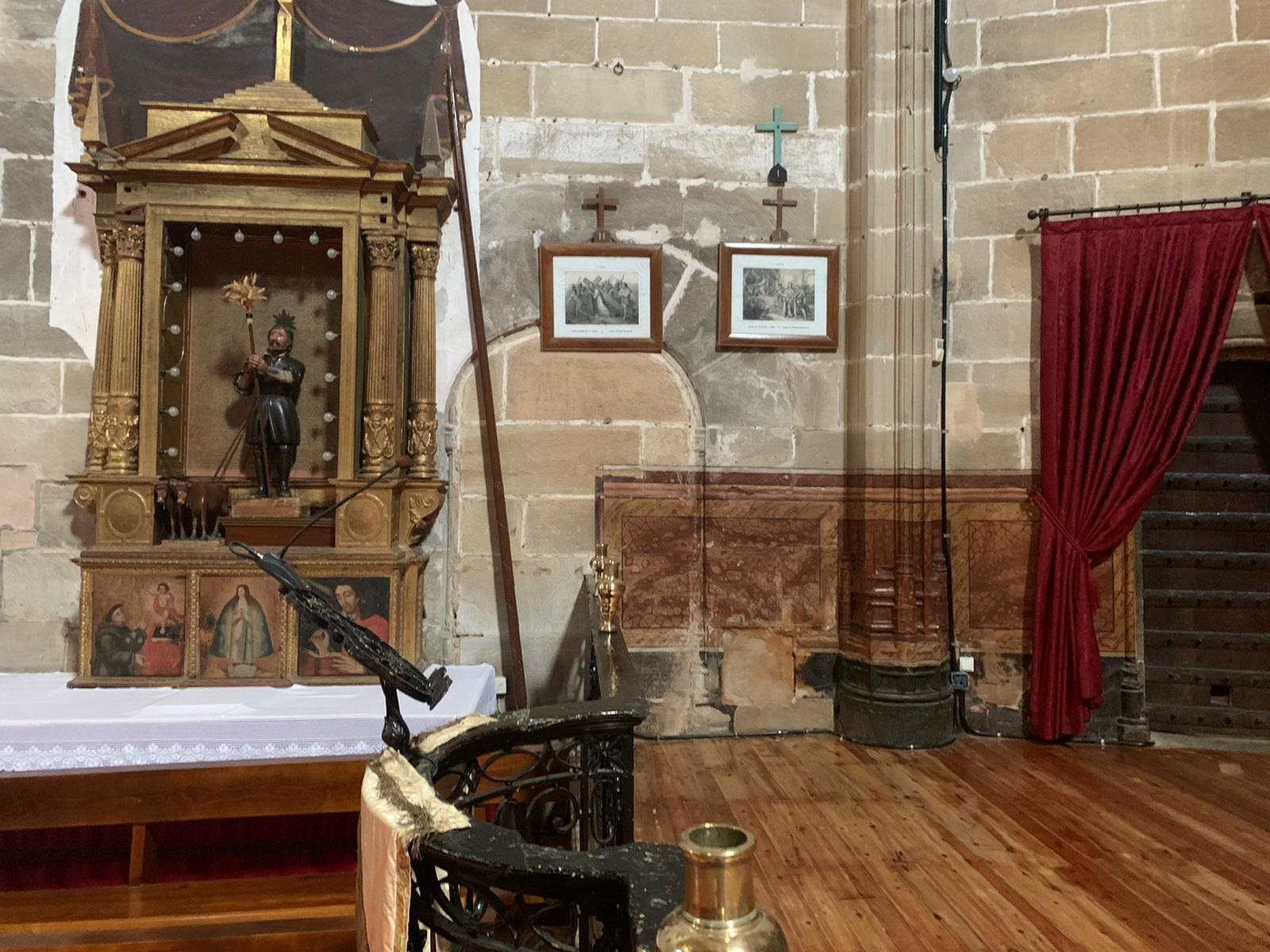 Es posible que nunca te hayas fijado en que dentro de la iglesia, en el lado del evangelio, justo entre el retablo de San Isidro y la puerta de la sacristía hay una puerta que se tapió. Esta puerta se debió de abrir cuando se hizo la iglesia y servía para acceder al exterior por el lado norte. No sabemos a ciencia cierta para qué se utilizaba, quizá era simplemente para acceder al exterior sin tener que dar toda la vuelta al edificio, o tal vez se empleaba para llegar al cementerio en situaciones concretas… La puerta era de arco de medio punto, con las dovelas de la parte superior claramente marcadas, en el interior tiene una moldura sencillita y por fuera de la iglesia también se puede ver, aunque con un poco más de dificultad, dónde se abría. Lo que sí sabemos seguro es que la puerta se tapió antes de que se reformara el presbiterio en 1800, ya que está pintado por encima con la misma pintura que el resto de la pared de la cabecera simulando un panelado de piedra.
