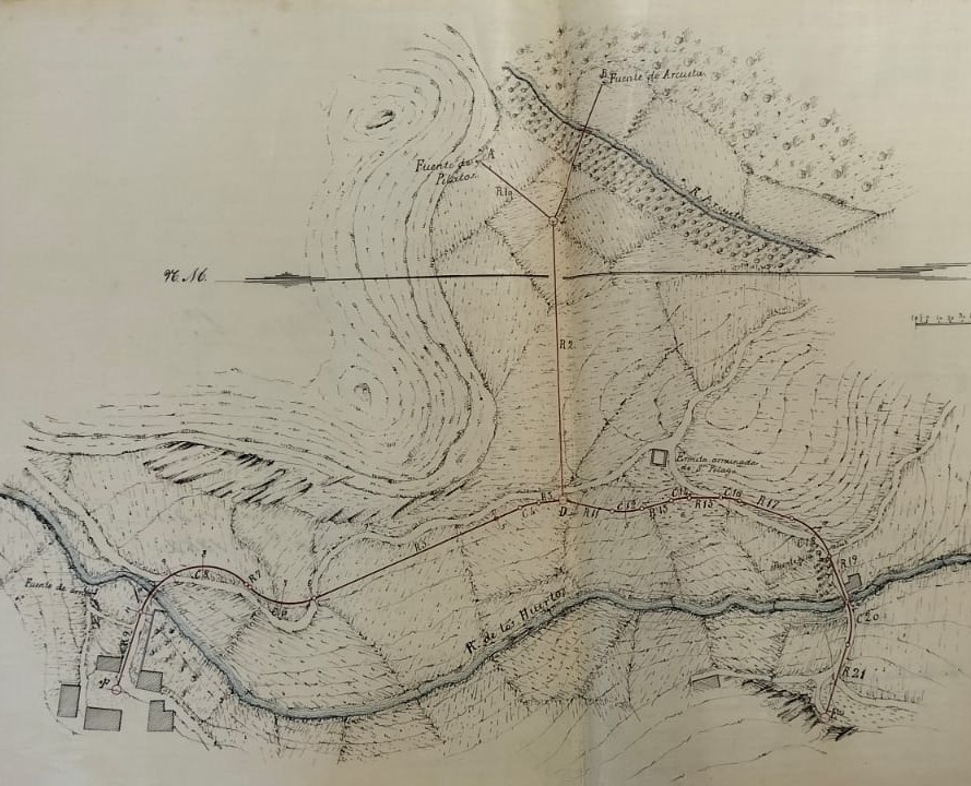 Según se detalló en el proyecto que se conserva en el Fondo Histórico del Ayuntamiento, se alegó que el pueblo no tenía acceso a suficiente agua para abastecer a todo el pueblo y que, aunque existían dos fuentes en el Río de los Huertos, cada vez que el río venía con crecida, las fuentes se cegaban y dejaban al pueblo sin agua. Se calculaba que esas fuentes aportaban 8 litros de agua al día por persona, mientras que se dice que como mínimo se necesitaban 16. Total, que había que hacer algo al respecto. Se pensó utilizar los manantiales de Arcueta y Pilatos, pues así se conseguiría llegar a los 72 litros/persona al día. Se decidió traer el agua por cañería cerrada, en lugar de por canal abierto, y hacerla de hierro fundido en lugar de palastro. Para la piedra se estableció utilizar la de las canteras más próximas al municipio, de piedra arenisca amarilla, para tallar los sillares. Los caños de la fuente se harían de bronce. También consta, con fecha de 1866, el proyecto de Gregorio Lahuerta para construir una “fuente económica” con depósito de aguas en el sitio denominado Pozo del Vicario. Para pagarlo se planeaba utilizar 1.840 reales del dinero que se otorgó en 1865 al Ayuntamiento para “atender a la calamidad del cólera, caso de que invadiese la villa”. La idea era construirlo con dos departamentos, para poder utilizar uno mientras se limpiase el otro. Finalmente, en 1964 Mario Martínez Gurrea proyectó un depósito de agua en el castillo por ser el punto más alto, y es el edificio en el que ahora está la sede de la Cofradía de la Santa Vera Cruz.