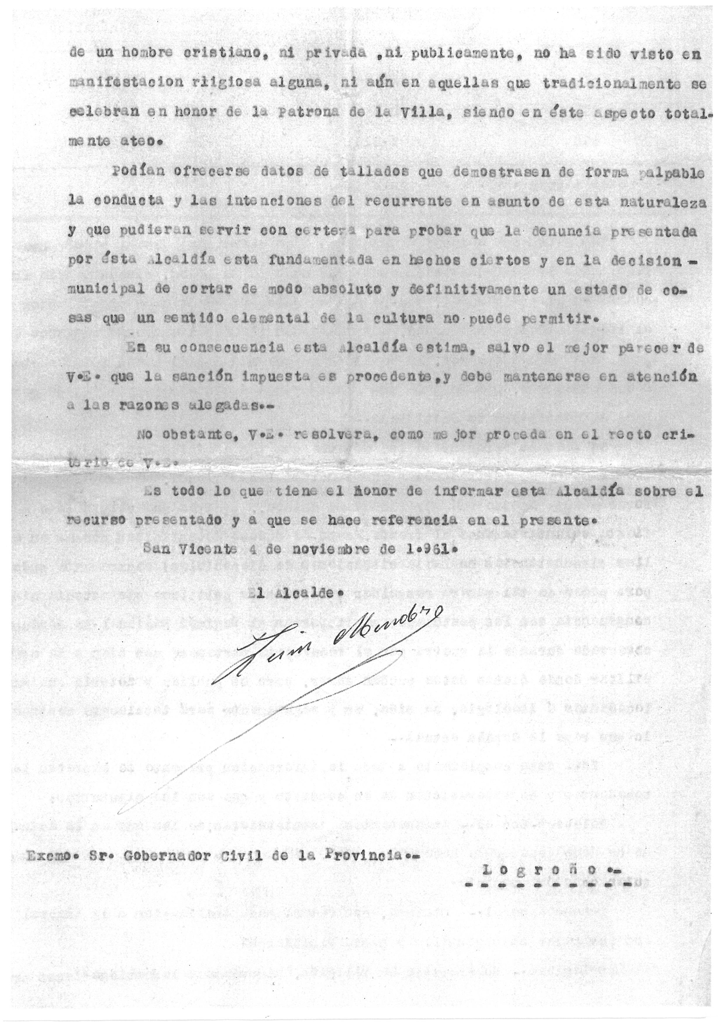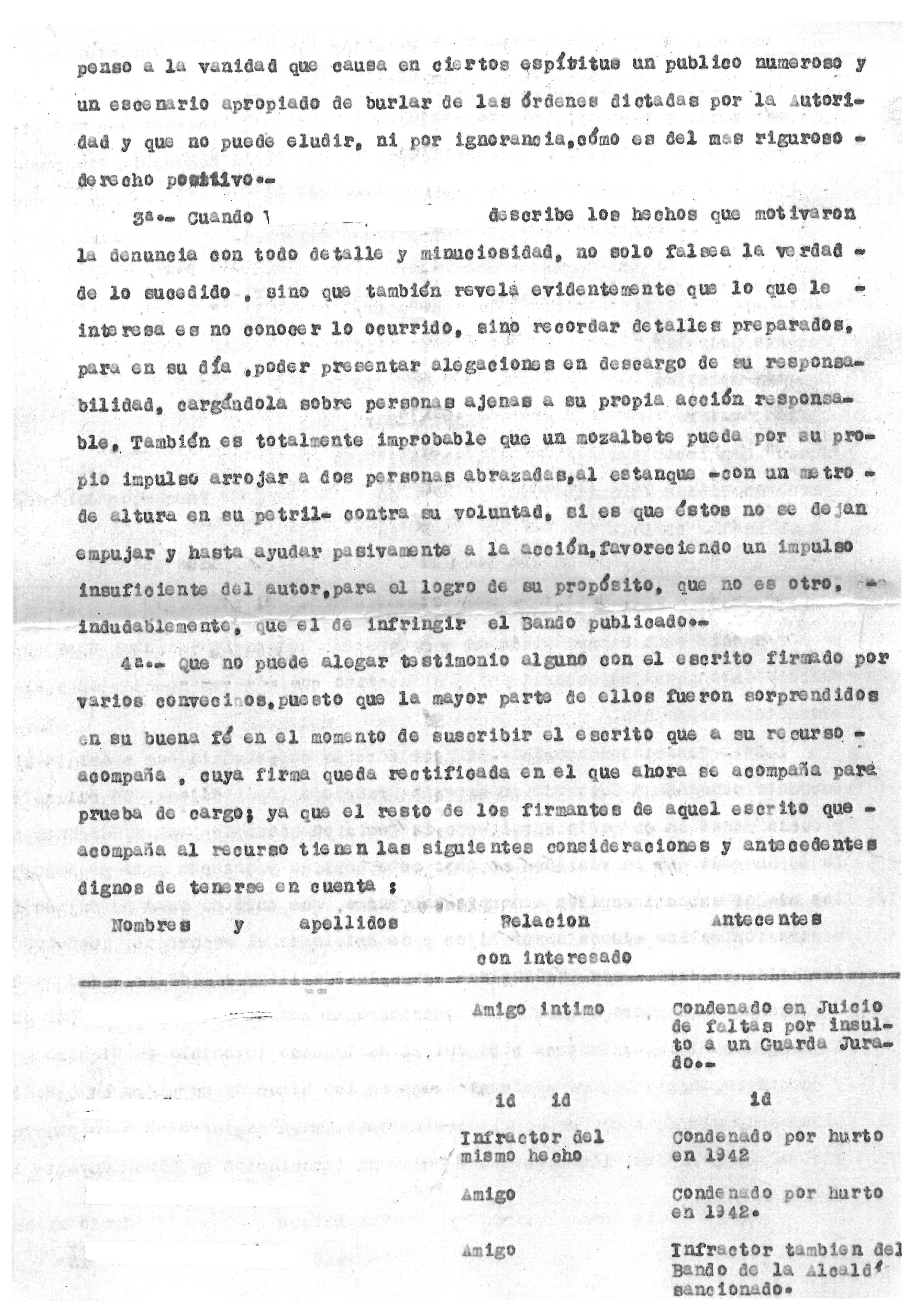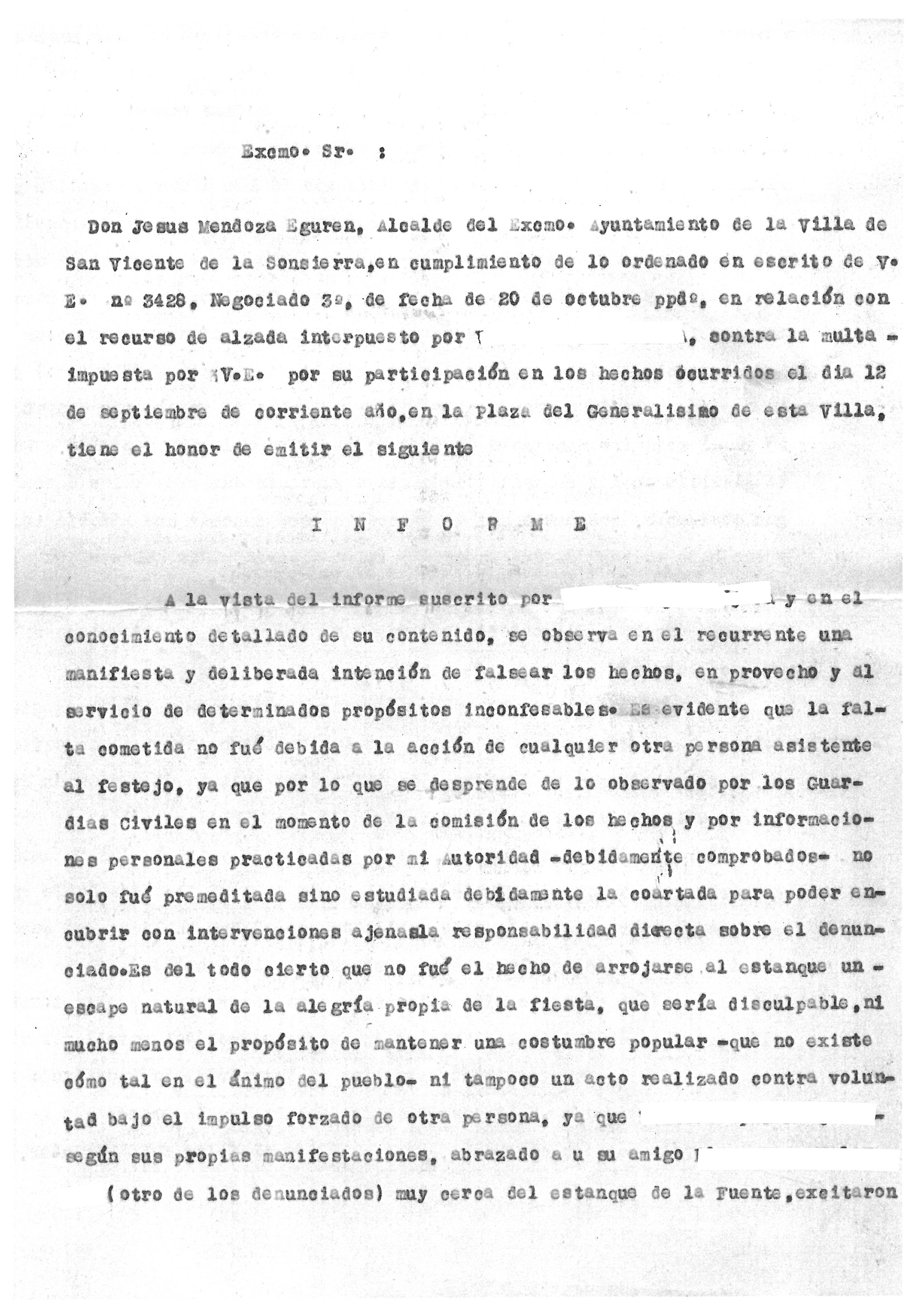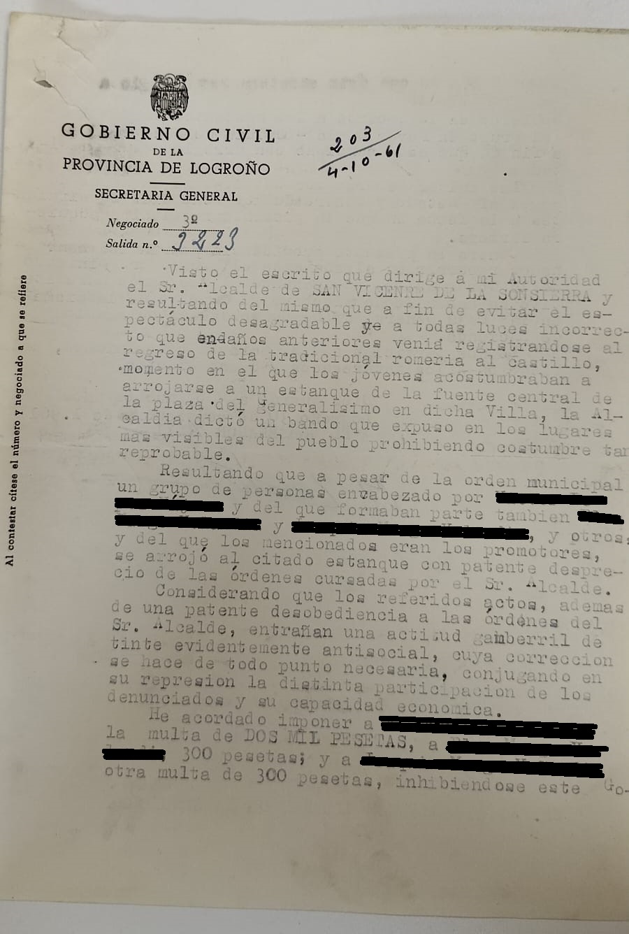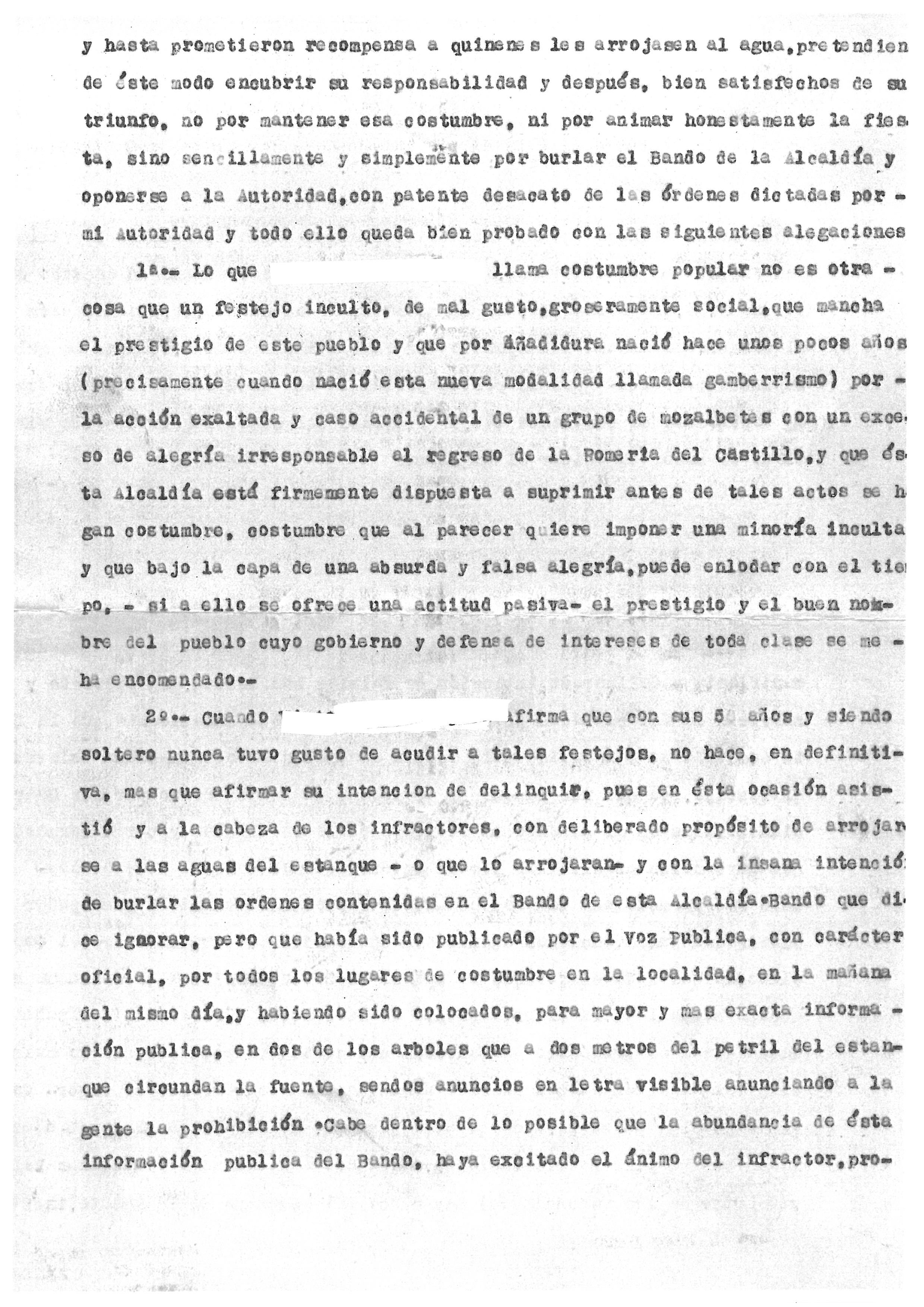 En 1961 esta costumbre estaba prohibida porque las autoridades locales lo consideraban indecente y vulgar. La misma mañana del último día de fiestas, cuando se debía realizar la romería al castillo, se colgaron carteles en los árboles de la plaza recordando que nadie debía bañarse en la fuente. Sin embargo, dos jóvenes del municipio llevaron a cabo un ardid para saltársela. La idea consistió en retar a que les empujaran para luego poder decir ellos “que yo no me he metido, es que me han empujado”. Pero el plan no les salió como esperaban pues fueron denunciados igualmente alegando las autoridades que estaba planeado con antelación, que por la altura de la fuente era imposible tirarles si ellos no colaboraban, y que los infractores y sus amistades tenían antecedentes de altercados siendo, además, sospechosos de ideología contraria al régimen. Tanto se ofendió el Ayuntamiento por la desobediencia, que la multa impuesta a uno de los “mojados” ascendía a 2.000 pesetas (mientras que una multa por tráfico, por desorden público o por incumplir la normativa de armas de fuego podía llegar hasta las 250 pesetas). Al resto de implicados se les multó con 100 o con 200 pesetas, según el grado de implicación en los hechos. Se les dio un plazo de 8 días para pagar, pero hasta enero de 1962 no se terminaron de abonaron todas las sanciones.