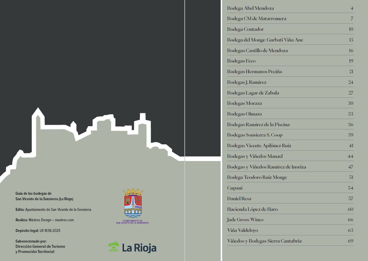 Dentro de la "Guía de Bodegas" podréis encontrar información sobre la historia y filosofía de las bodegas de San Vicente de la Sonsierra, así como una relación genérica de sus vinos y los datos de contacto para visitas. Se incluye un mapa en el que se indica la ubicación de cada bodega y los datos de la Oficina de Turismo.