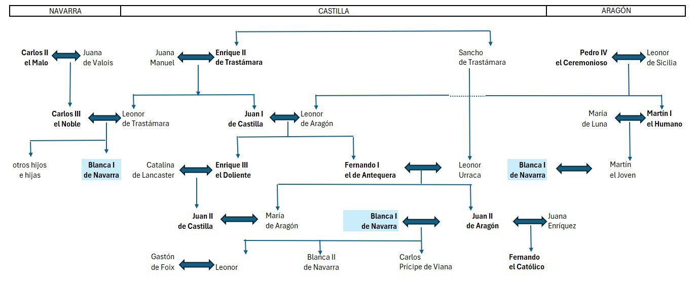 Antes de empezar, te dejo un esquema de sus relaciones familiares para intentar ubicarnos un poco. Fíjate que a Blanca I de Navarra la tenemos en tres lugares porque con sus dos matrimonios es complicado representar los lazos entre ellos.