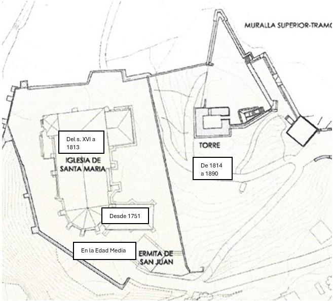 Cuando se hizo la intervención arqueológica de 2012 en la Torre Mayor se encontró que el piso estaba lleno de enterramientos. Pero no tumbas, sino cuerpos apilados de cualquier manera, lo que indica prisa y poco cuidado, seguramente por alguna de las epidemias de cólera que tuvieron lugar entre 1834 y 1885. Aparecieron clavos, así que algunos muertos sí que fueron con ataúd, pero otros debieron de ser depositados cubiertos con un sudario y nada más. Para hacer estos enterramientos, en su día se excavó hasta llegar a la roca, de forma que cualquier resto arqueológico medieval de cuando se construyó la torre se perdió en aquel momento.