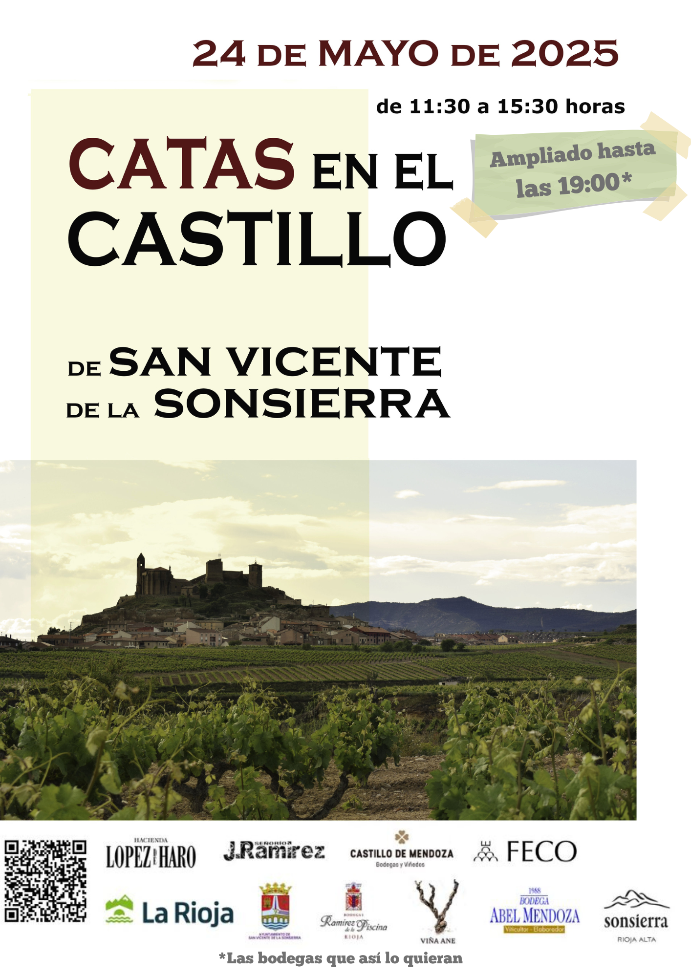 El 24 de mayo vuelven las catas en el Castillo para que disfrutes de los colores del otoño en el paisaje del viñedo, del patrimonio y de los excelentes vinos sonserranos en el mejor entorno para hacerlo, en el interior de los calados del recinto amurallado. De 11:30 a 15:30, con horario ampliado a 19:00 horas (HACIENDA LÓPEZ DE HARO y LURENA RAMÍREZ) los visitantes podrán degustar vinos de calidad con personalidad propia en un entorno incomparable, los calados del castillo, mientas comentan los detalles de la elaboración con los propios viticultores y bodegueros.